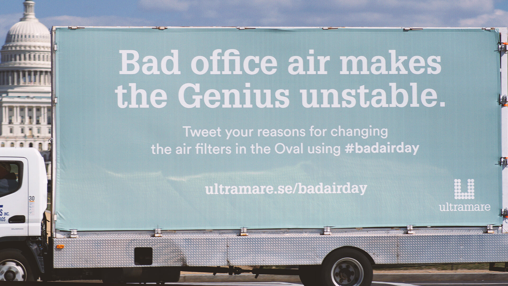 Dålig luft på kontoret sänker beslutsförmågan med 10%. För att sprida budskapet beslöt sig luftfiltertillverkaren Ultramare att sponsra det kontor där förbättrad beslutsförmåga skulle kunna göra absolut störst skillnad – det ovala.