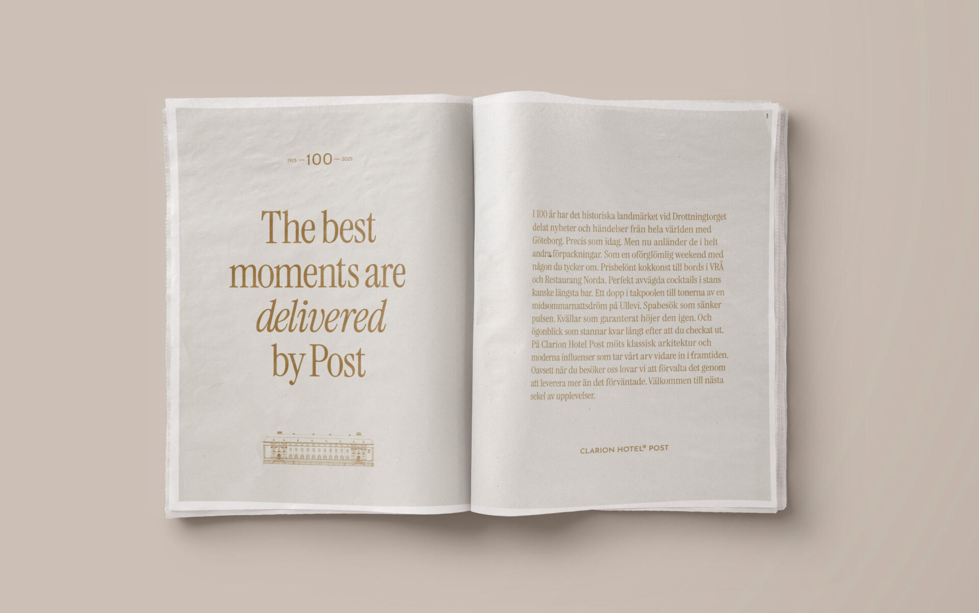 Sedan 1925 har Posthuset, ett av Göteborgs mest ikoniska landmärken, varit en destination för nyheter från omvärlden. Inför 100-årsjubileet sjösatte vi ett långsiktigt koncept tillsammans med Clarion Hotel Post som lyfter det historiska arvet, förpackar erbjudandet och pekar ut riktningen för nästa sekel av upplevelser. Levererade med ambitionen att alltid överträffa det förväntade.